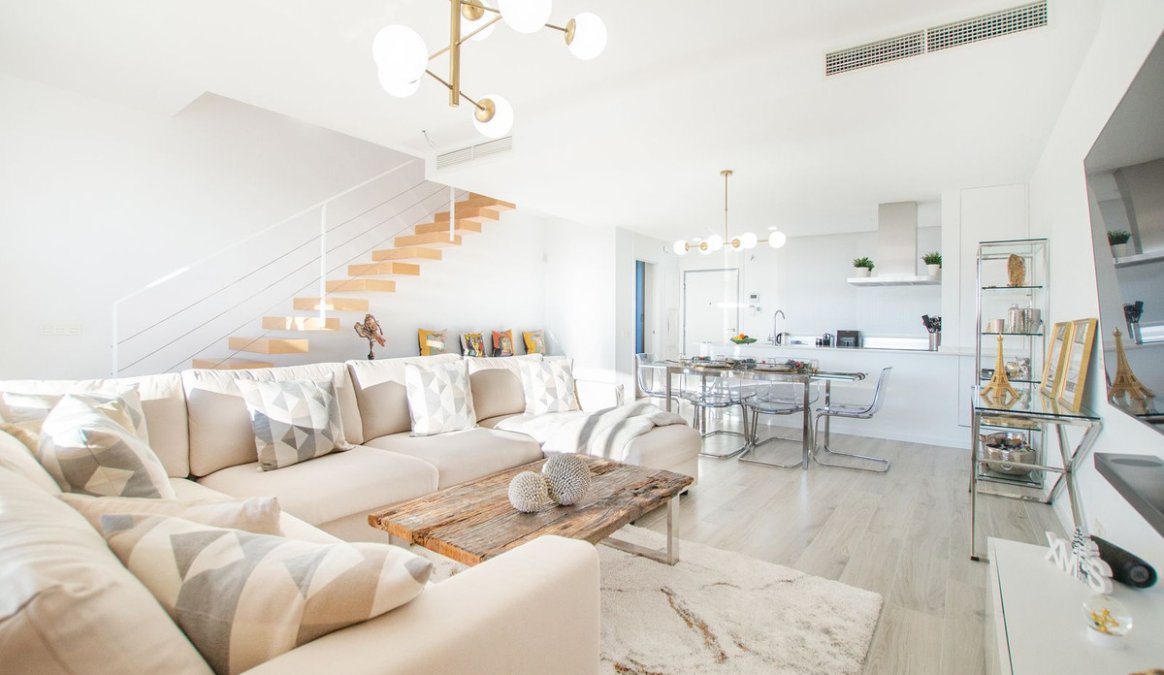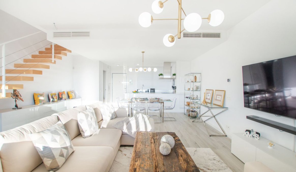 Impresionante casa adosada de tres dormitorios cuenta con un diseño espacioso contemporáneo con interiores luminosos que se abren a las amplias terrazas y un solarium en la planta superior.