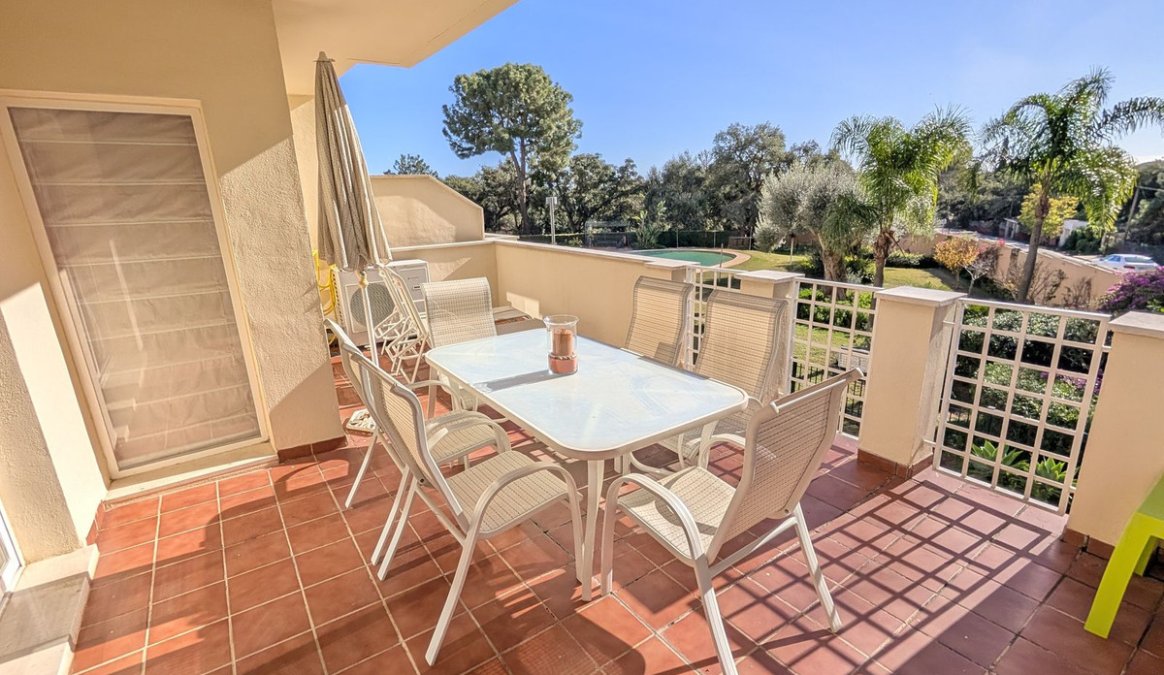 Amplio piso en planta primera en esquina situado en el exclusivo complejo Residencial de Los Jardines de Santa Maria Golf.Acabados de alta calidad,seguridad 24h,5 piscinas,amplios jardines y a poca distancia de todas las comodidades en Elviria, tales como restaurantes, bares,tiendas, supermercados y la playa a un corto paseo.