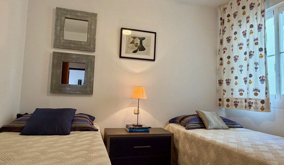El apartamento está en la 3ª planta en una buena urbanización (EMBAJADA) con una bonita piscina comunitaria, e incluso desde esa piscina tienes vistas al mar y al puerto.
