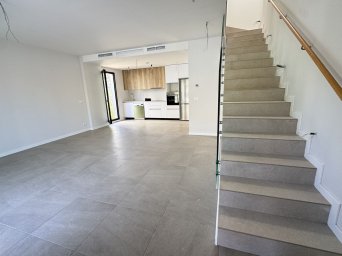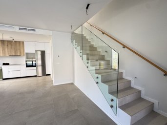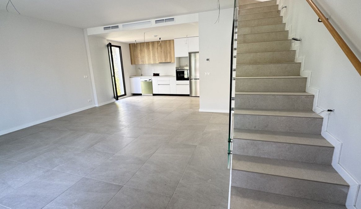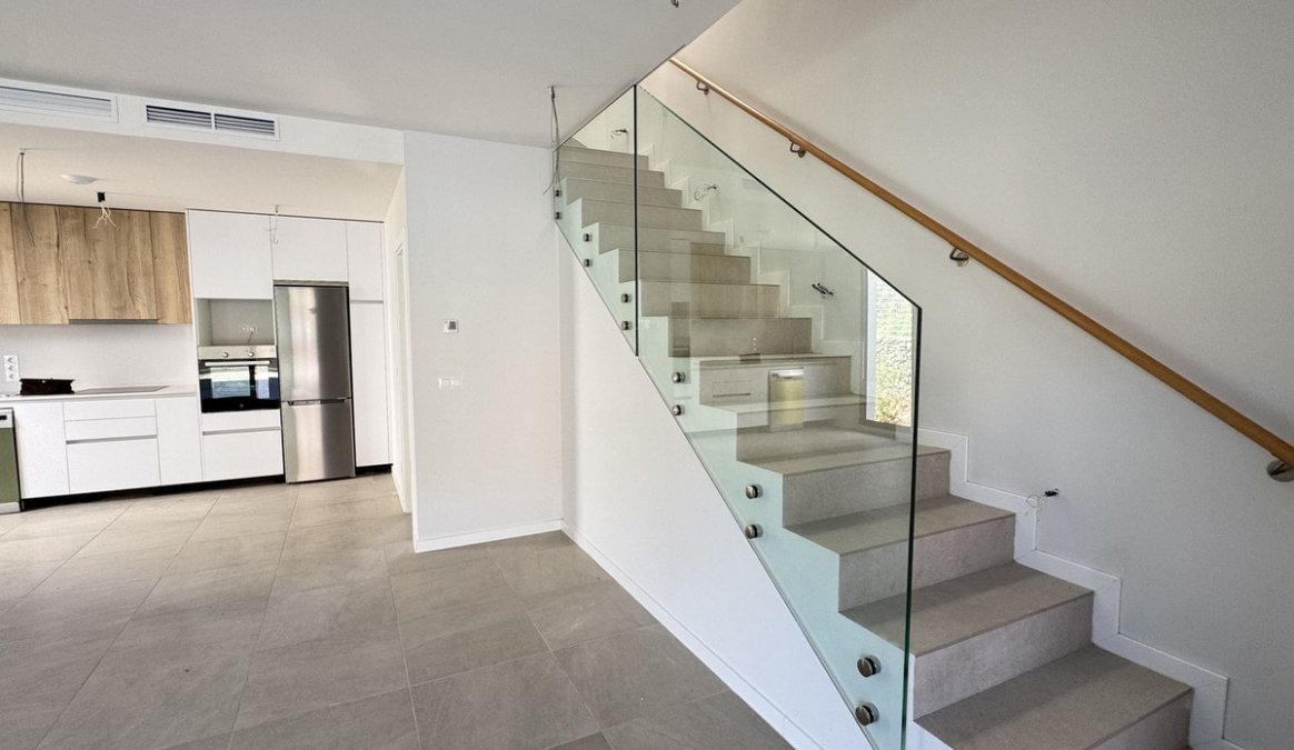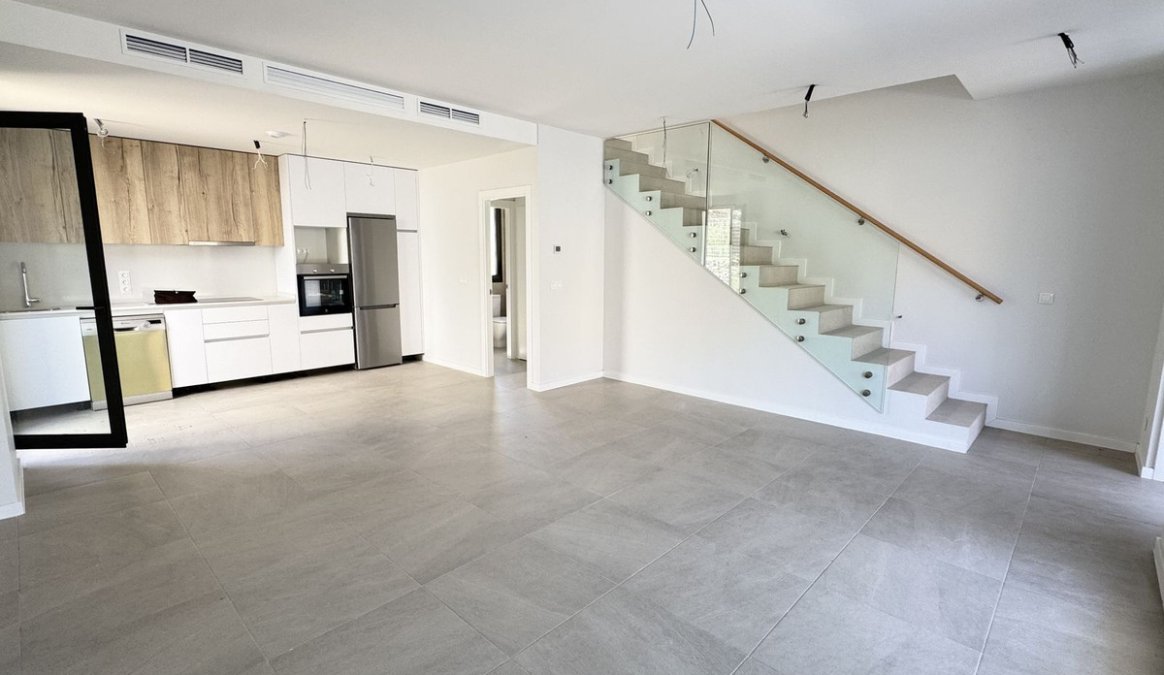 El espacio de salón de planta abierta se conecta perfectamente con la cocina completamente equipada, que incluye electrodomésticos modernos y mobiliario de alta calidad. Una llamativa escalera con barandilla de vidrio realza el diseño moderno y crea una atmósfera luminosa y aireada.