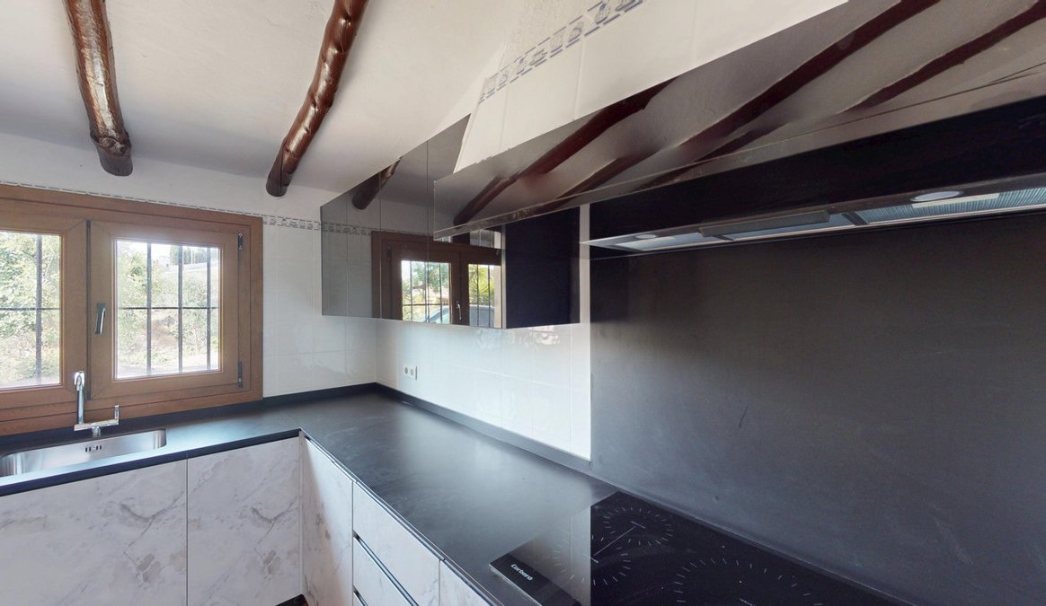 Esta encantadora villa española, situada en Viñuela, Málaga, ofrece una combinación perfecta de encanto tradicional y comodidad moderna. La propiedad, de una sola planta, tiene una superficie de 167 m2 y cuenta con tres dormitorios, incluido un amplio dormitorio principal de 13,9 m2, y dos baños. Al entrar, lo primero que llama la atención es el hermoso suelo de baldosas de terracota que recorre toda la casa, creando una atmósfera auténtica y cohesionada. Las zonas de estar se caracterizan por sus techos altos e inclinados con vigas de madera vistas, que aportan un toque rústico y atractivo visual. El corazón de la vivienda es sin duda el salón, que tiene como punto focal una magnífica chimenea de piedra. Los grandes ventanales y puertas acristaladas de esta zona, así como de los dormitorios, permiten que la luz natural inunde los interiores y ofrecen vistas pintorescas del paisaje circundante. La cocina presenta una combinación armoniosa de diseño tradicional y contemporáneo. Electrodomésticos modernos y muebles elegantes contrastan con las vigas rústicas del techo, creando un espacio culinario funcional y estéticamente agradable. Los baños, aunque no detallados extensamente en las imágenes, parecen haber sido actualizados con accesorios modernos.