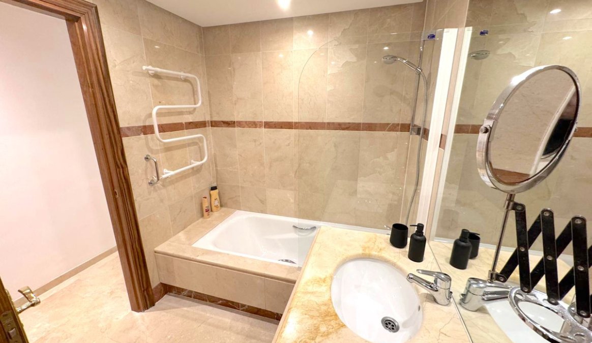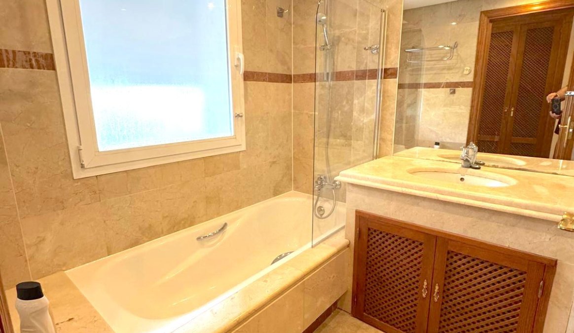 Upon entering, you immediately feel the spaciousness and brightness thanks to the well-thought-out layout. The apartment has three bedrooms, each generously sized, ideal for providing maximum comfort to its residents. The master bedroom features an en-suite bathroom, finished with high-quality materials, including a modern shower and a large bathtub, creating the perfect space to relax after a busy day. The other two bedrooms also have en-suite bathrooms, ensuring privacy and comfort for all family members.