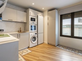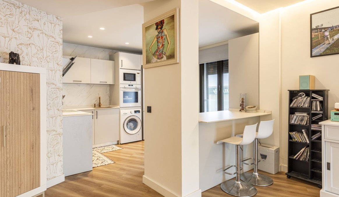 Located on the first floor, the apartment features a bright south-facing terrace overlooking the street — ideal for watching the city come to life and enjoying the authentic feel of Estepona’s everyday energy.The open-plan layout connects the spacious living room with the modern kitchen, offering a seamless flow and a welcoming social space.