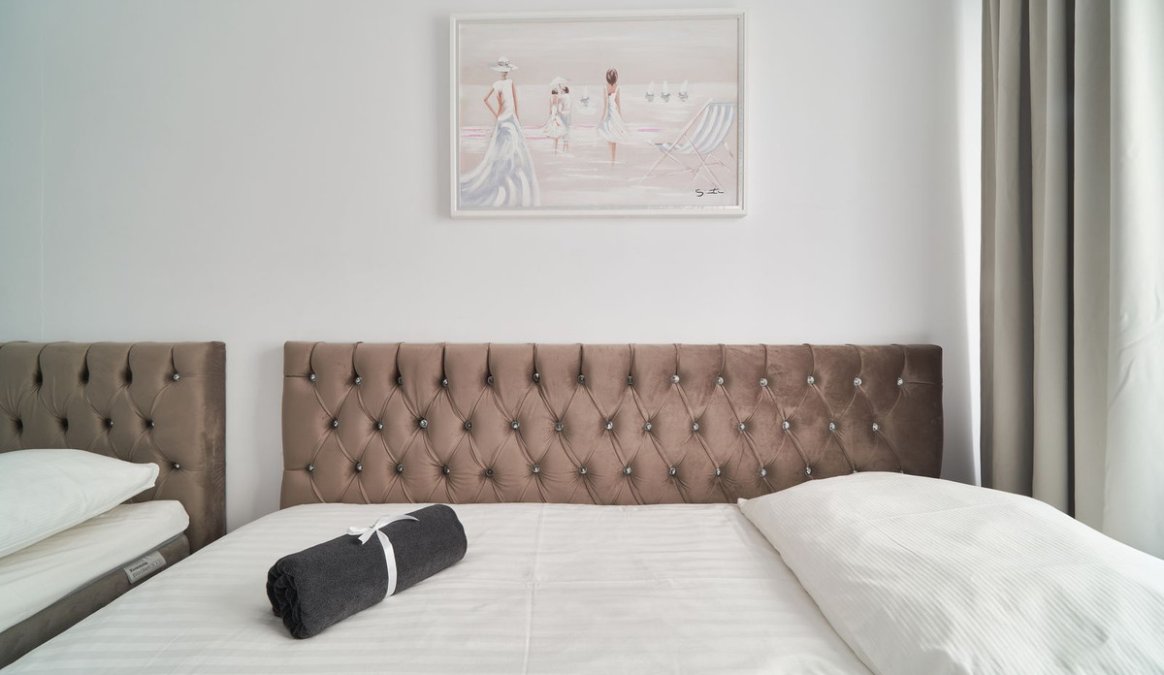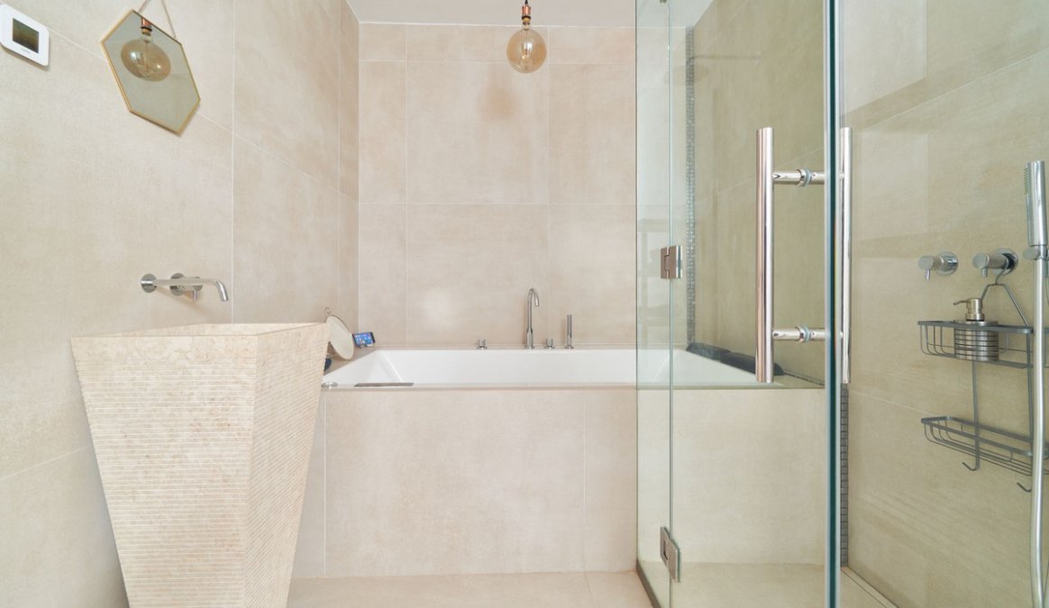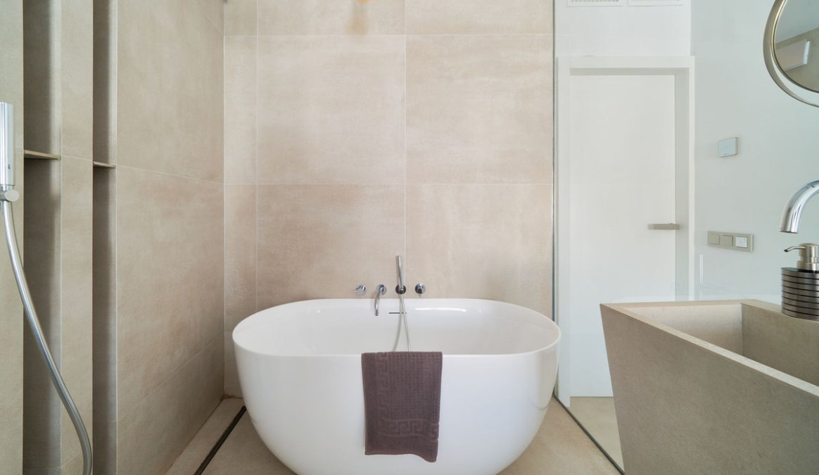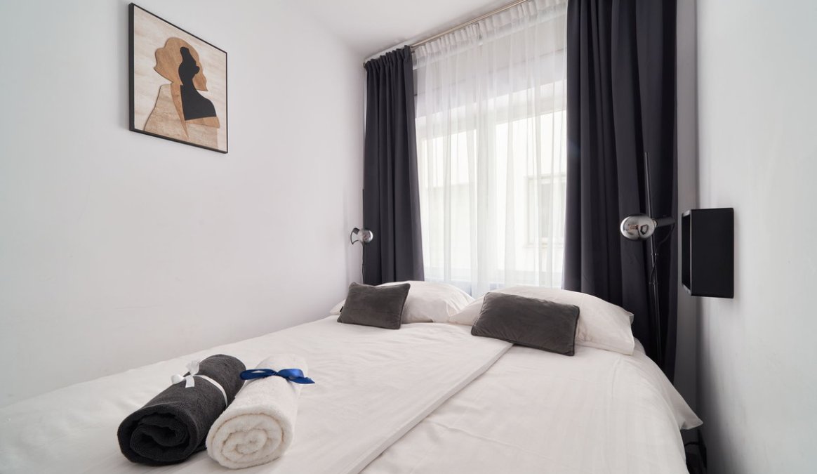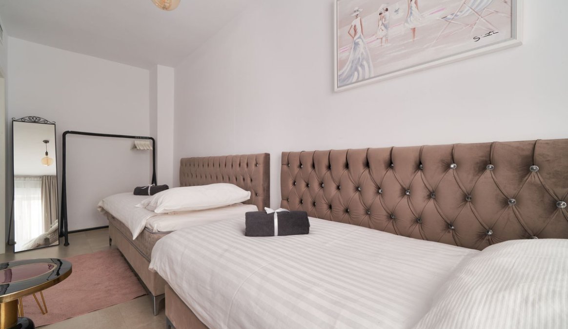 The apartment has a modern, fully equipped kitchen, a large master bedroom with en-suite bathroom, and a second bathroom with a jacuzzi and shower.