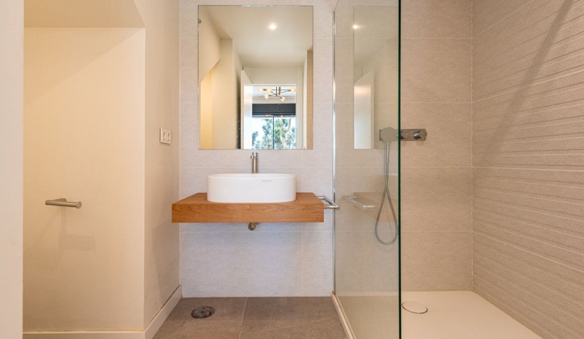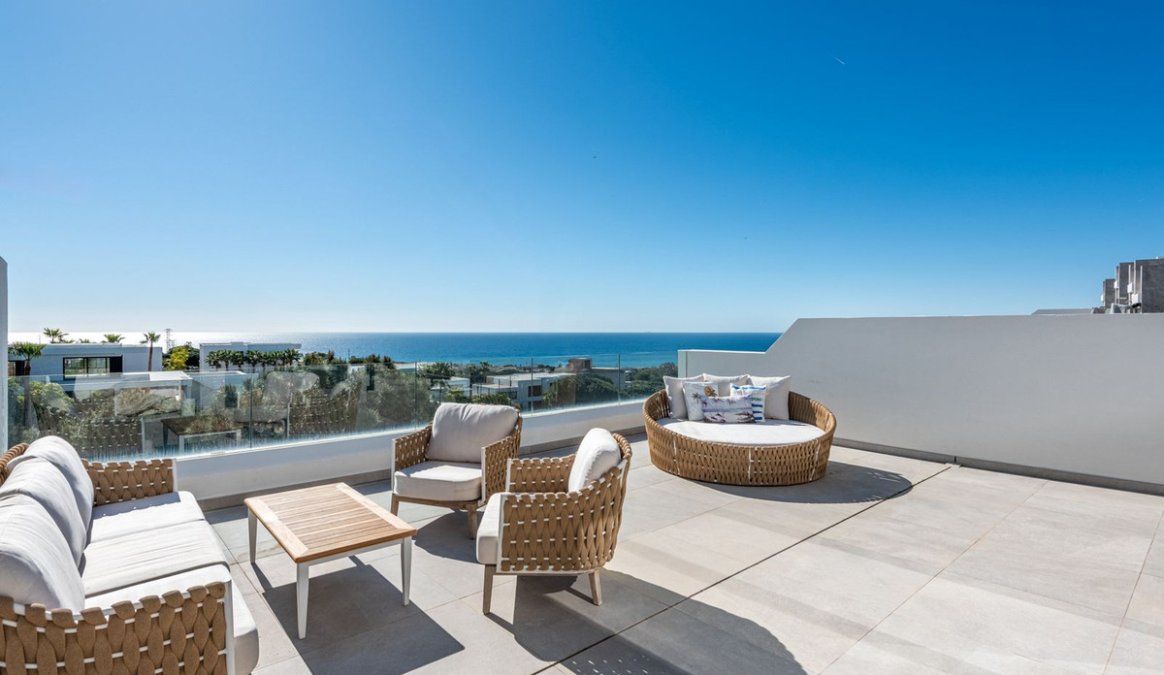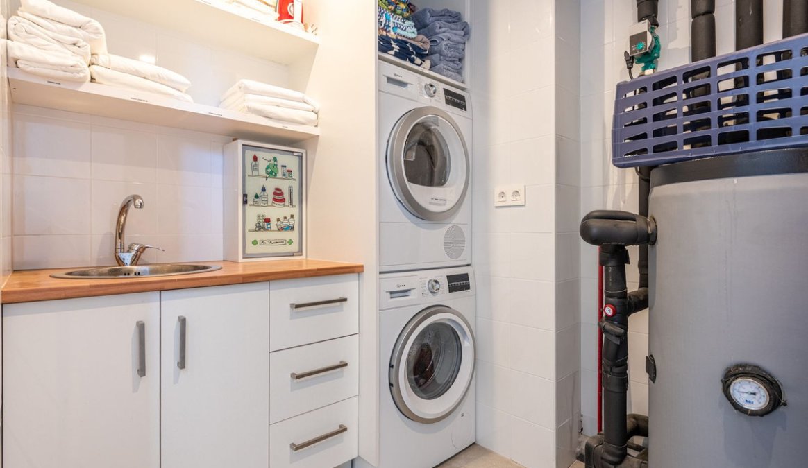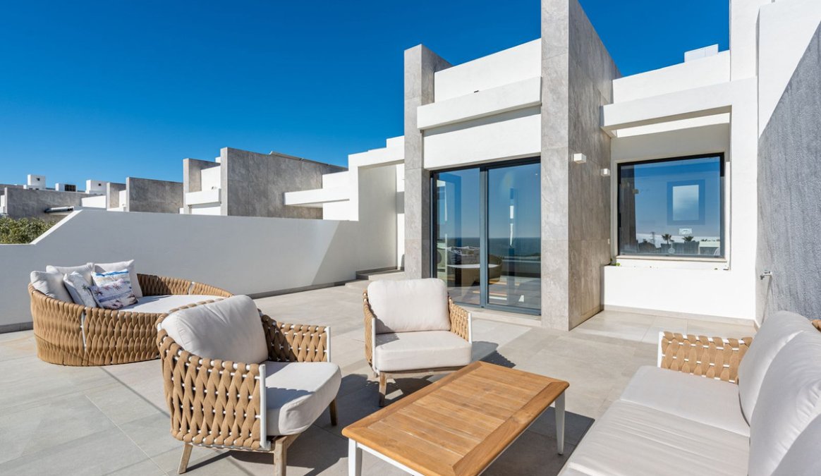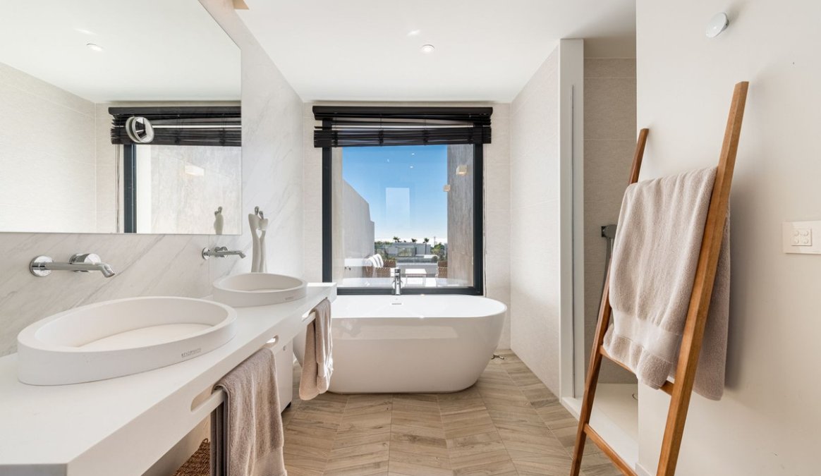 The house offers 3 bedrooms, all with en-suite bathrooms, a guest toilet, and a practical storage/laundry room. The open-plan living room and kitchen lead directly out to a wonderful terrace, while the large floor-to-ceiling windows fill the home with natural light and create a sense of space and luxury.
