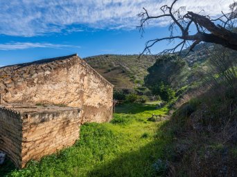 The land itself is generous and fertile, stretching out like a promise. Fruit trees grow freely, filling the air with their natural fragrance—lemon trees heavy with golden fruit, continuing to thrive even without care, as if the earth refuses to stop giving. Beyond them, vineyards shape the landscape with quiet elegance, inviting you to imagine your own harvests, autumn afternoons among the vines, and the simple pleasure of crafting your own wine from the very soil beneath your feet.