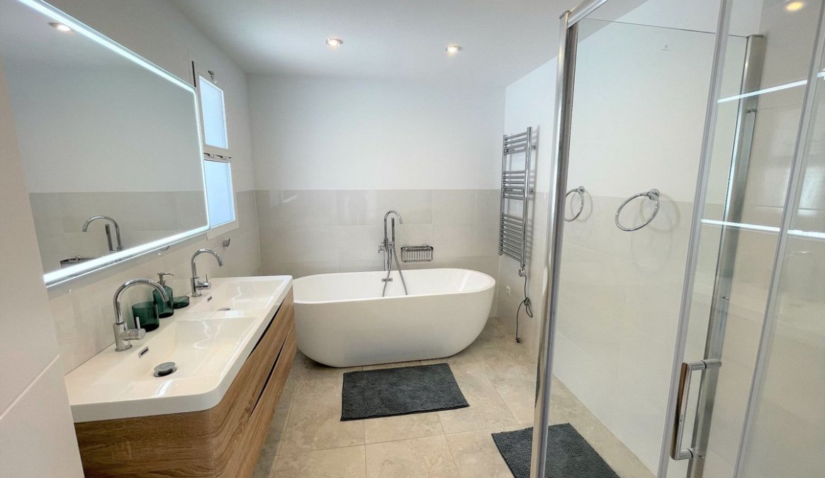 Upon entering, you’re welcomed by a spacious, open floor concept and the stunning view of the pool area, sheltered between the 2 wings of the house. One wing hosts two double bedrooms and a stylish family bathroom with tub and double sink, just down the hall from the kitchen and breakfast area.