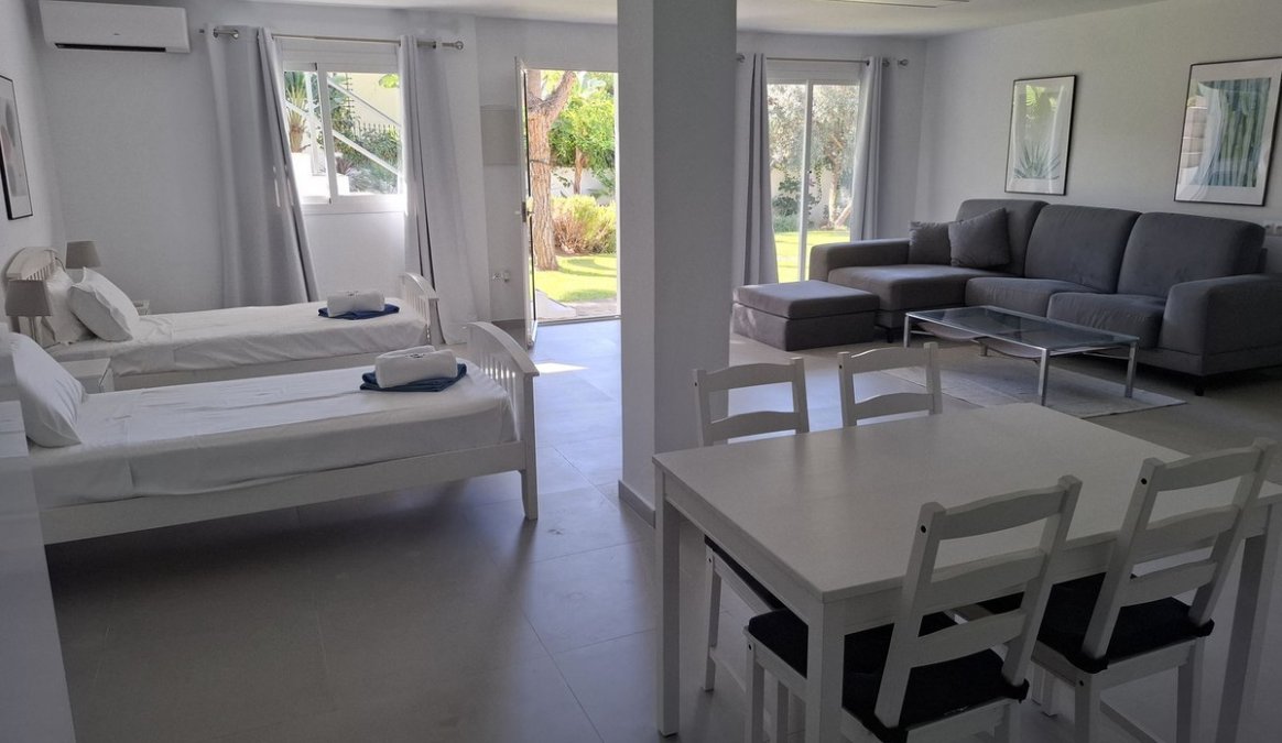 Downstairs, with its own entrance and direct access to the lush garden we find the very spacious 70m2 private studio apartment, featuring a full kitchen, bathroom with shower, washing machine, lounge area with pull-out couch, 2 single beds, and air conditioning.