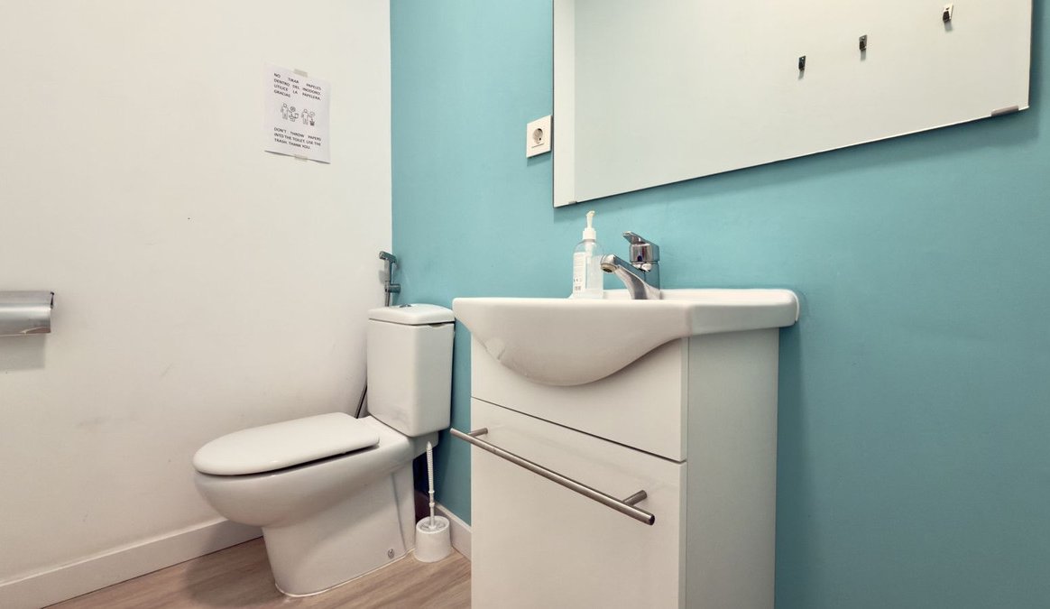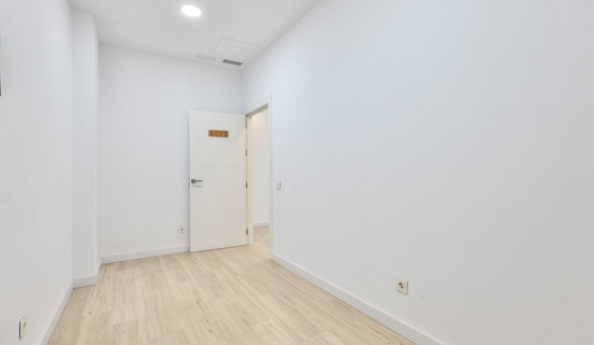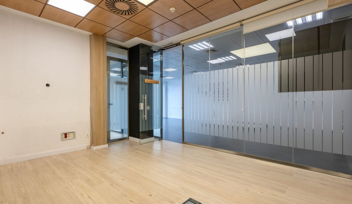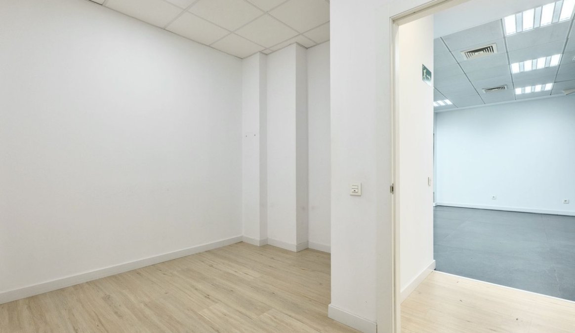 The layout includes four independent offices, a large open-plan hall ideal for reception or shared workspaces, and two bathrooms, one of which is adapted for people with reduced mobility. The premises are equipped with air conditioning, as well as water and electricity supplies, ensuring full operational comfort.