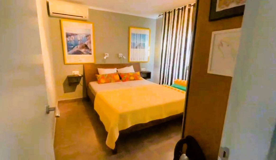The living area opens onto 2 spacious bedrooms with fitted wardrobes and 2 bathrooms/shower rooms. The master bedroom has an en-suite bathroom, and there is access to a separate bathroom for guests. Hot and cold air-conditioning is installed in both bedrooms.