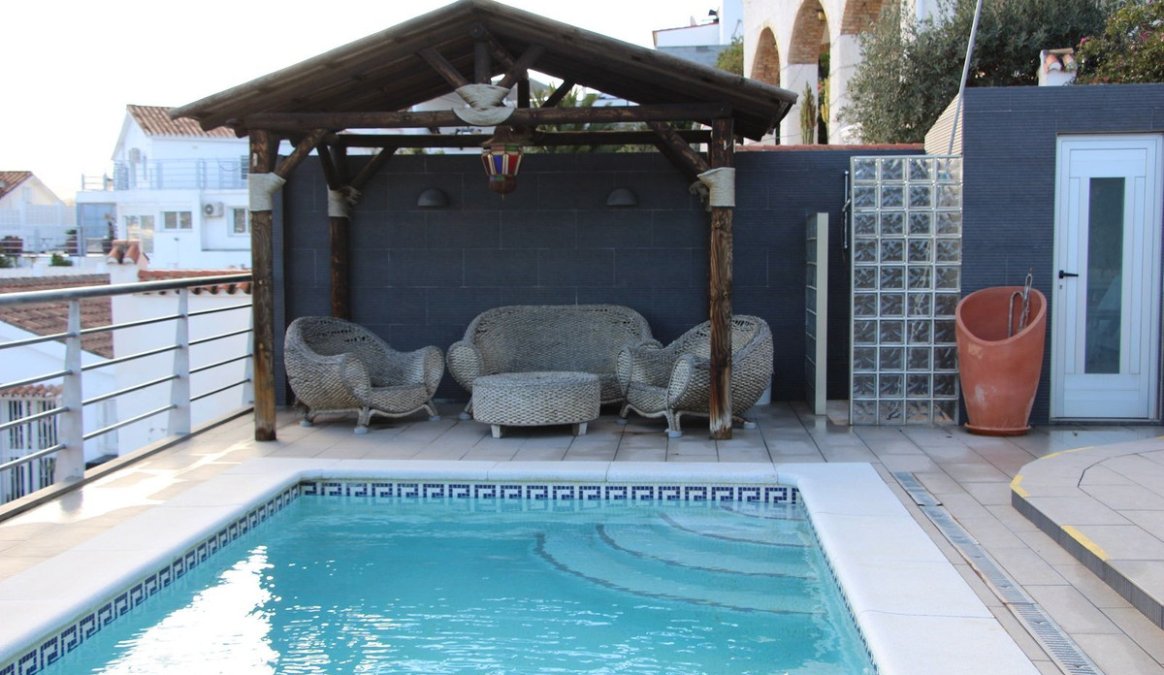 A private salt-water swimming pool, a seated covered area, a shower and a separate W/C. To the left of the house is a space for barbequing, and to the right are mature fruit trees and a walkway to the extra parking, with a gated entry. Entrance to a storage room at the rear of the property, containing a water softening system.