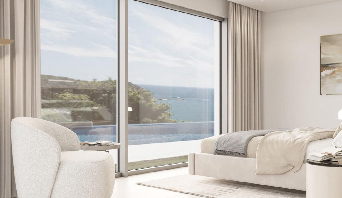 The ground floor features a bright and spacious living and dining room with abundant natural light streaming through large windows, an open-plan kitchen, and direct access to the terrace, pool, and garden area with open panoramic sea views. Additionally, there are two en-suite bedrooms on this floor.