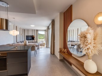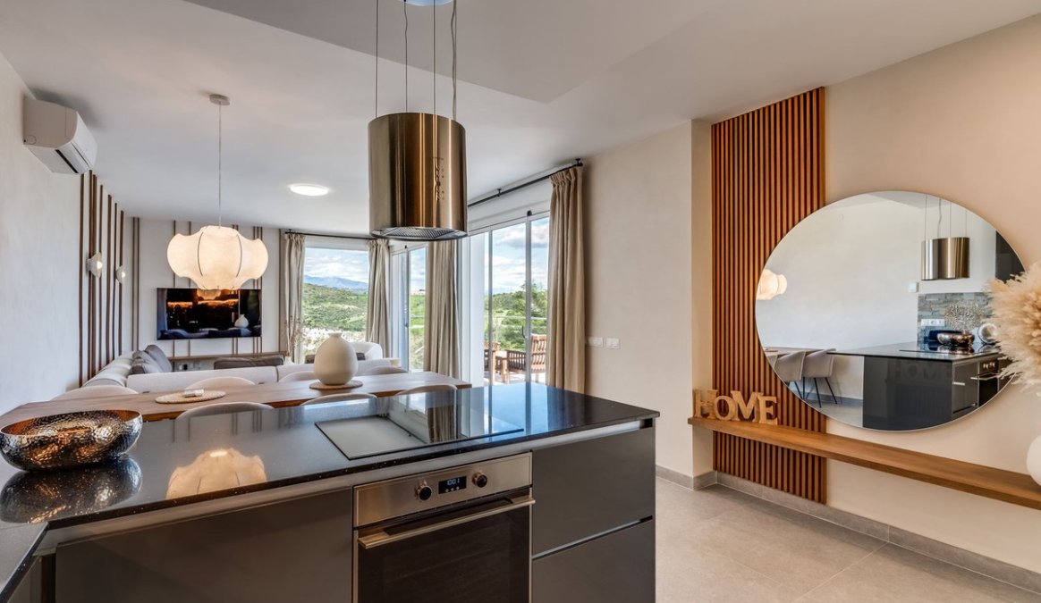 The living room and open-plan kitchen form the central heart of the home. The kitchen is fully equipped with modern appliances and perfect for daily living or enjoyable dinners with family and friends.