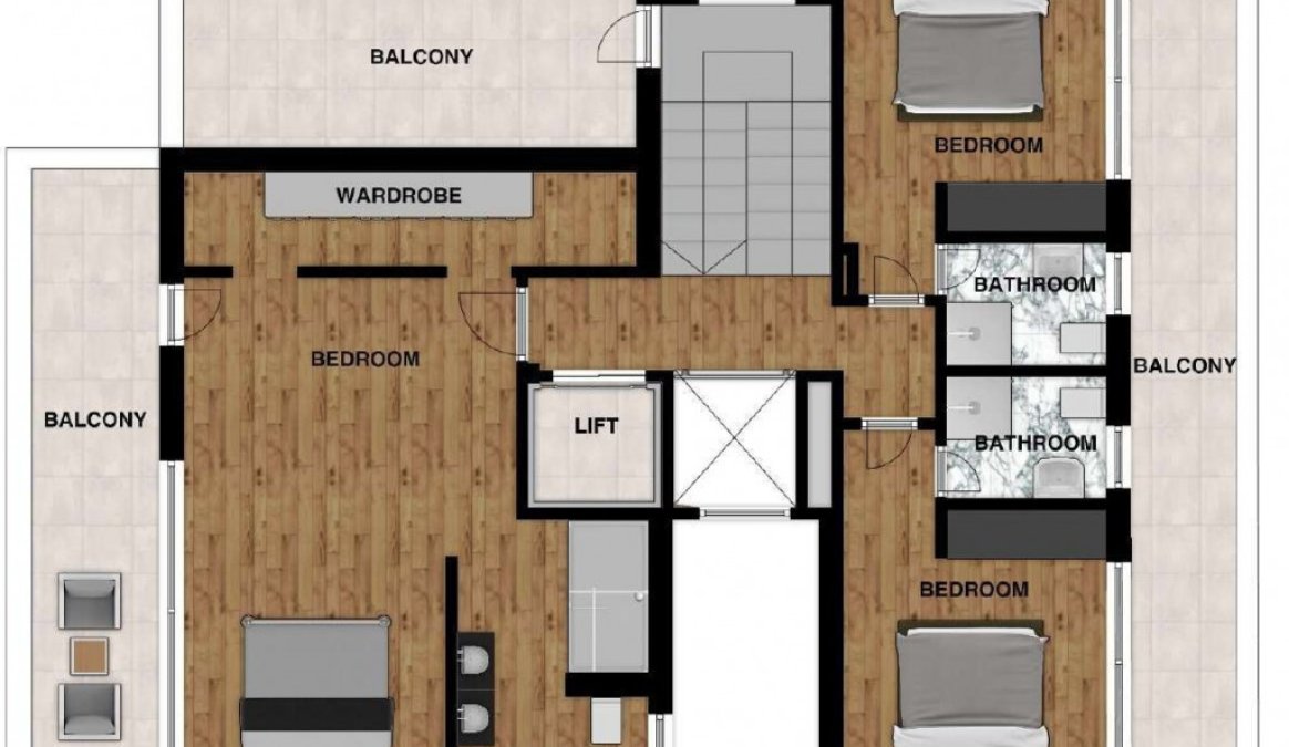 On the second floor there are one large bedroom with a wardrobe and a separate bathroom and 2 normal size bedrooms, 1 bathroom, and a study area.