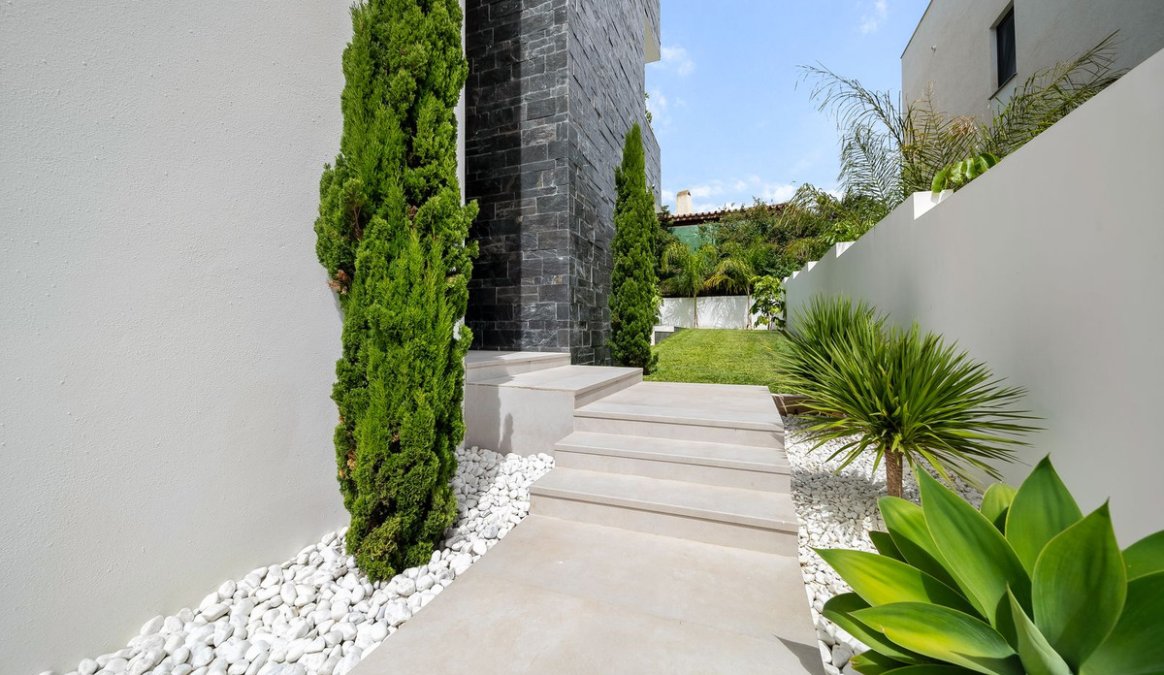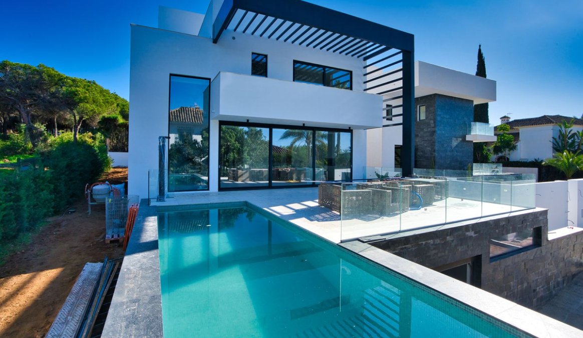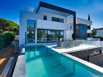 The house is a three-storey modern style luxury villa with a 3x10m outdoor heated pool on the patio.