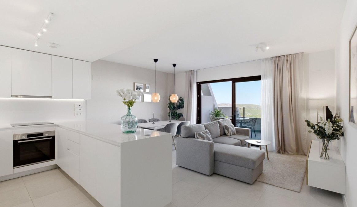 The property offers a bright open-plan living space with a modern fully fitted kitchen, seamlessly connected to the lounge area. Large sliding doors lead directly onto a spacious terrace, ideal for relaxing or entertaining while enjoying the views.