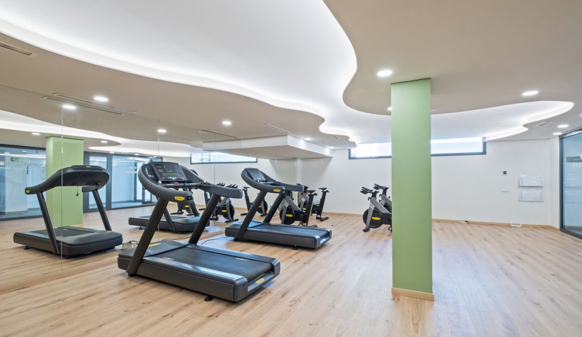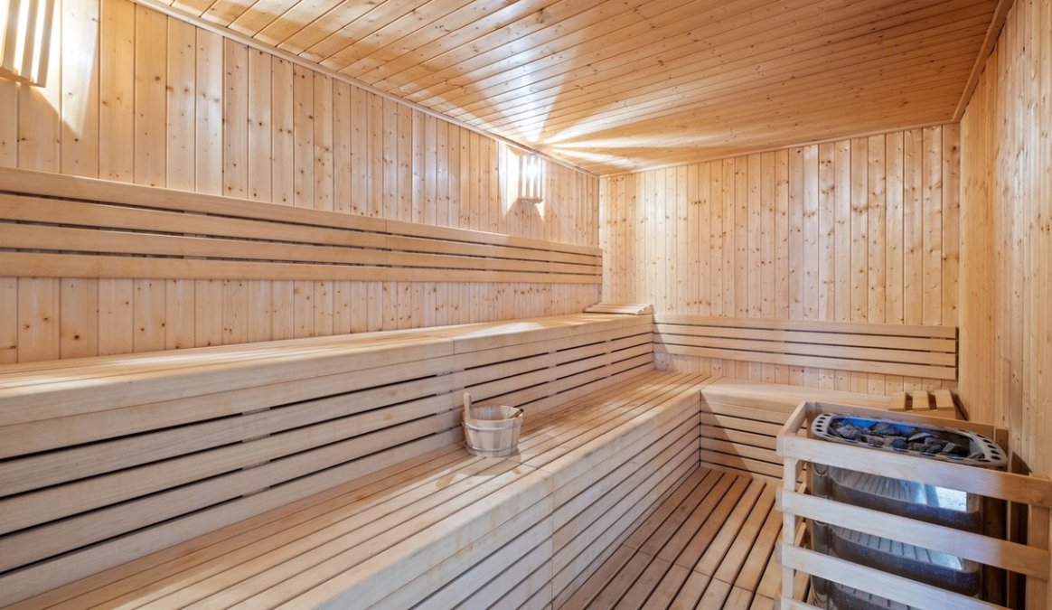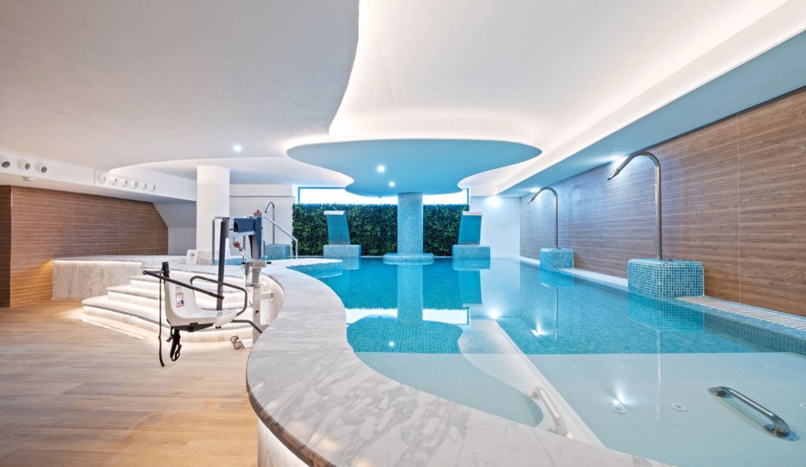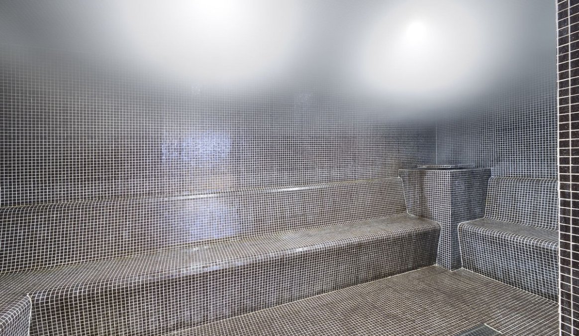 Residents benefit from excellent communal facilities, including an outdoor swimming pool, indoor pool, fully equipped gym, sauna, and a relaxing turquoise bath area.