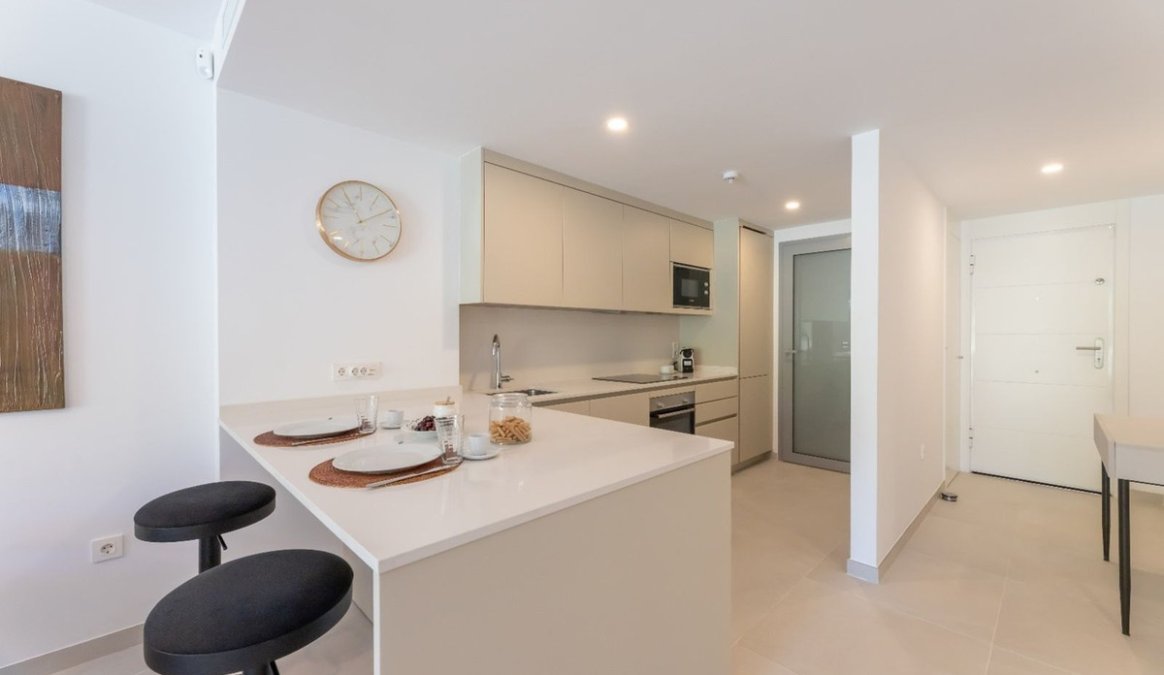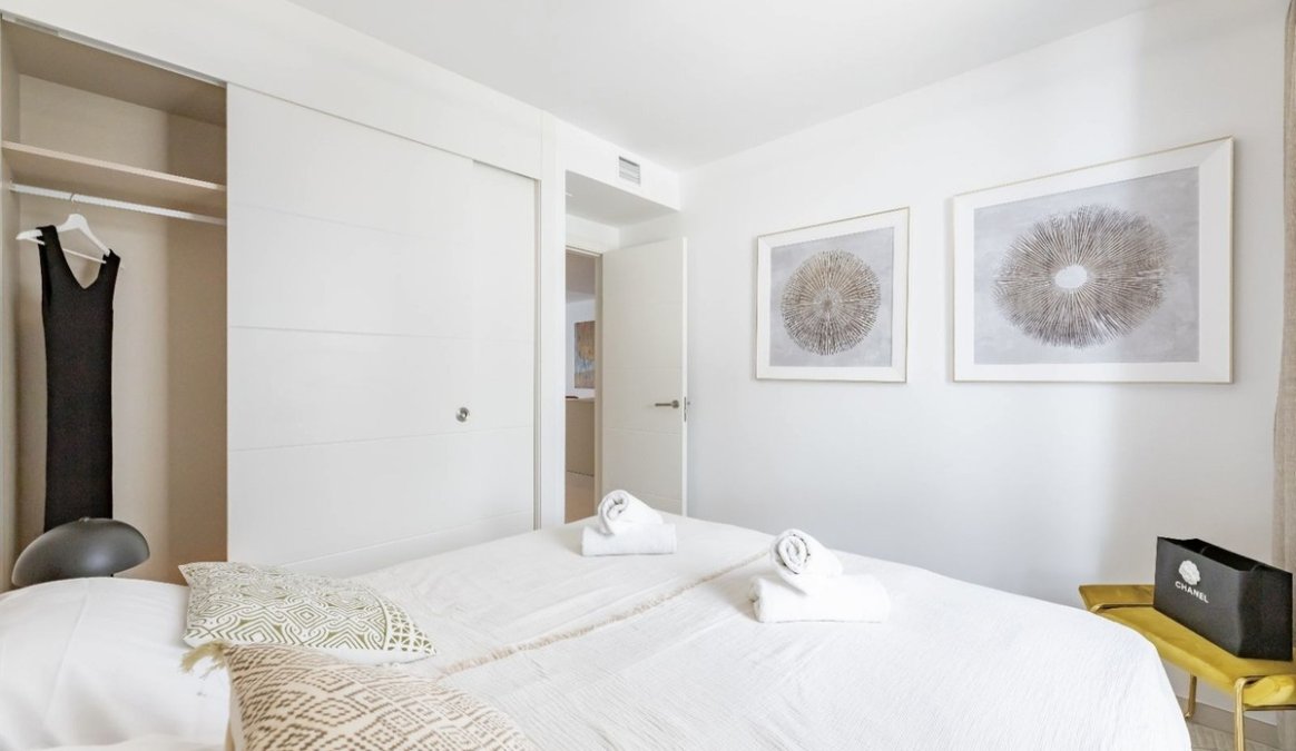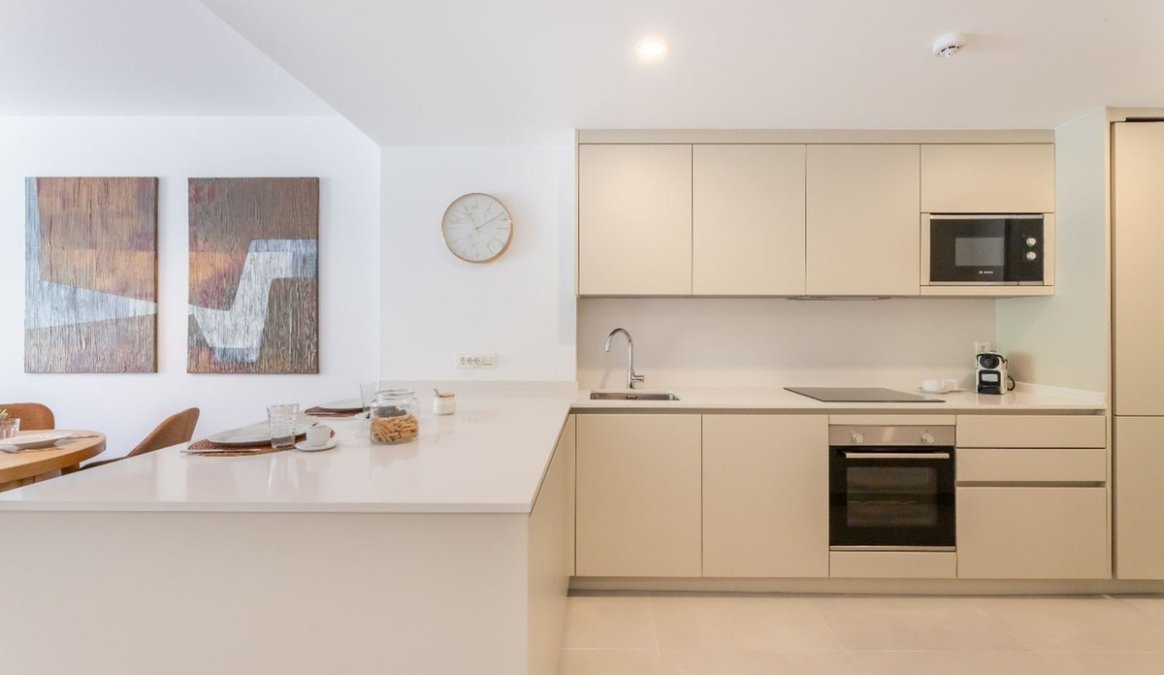 The apartment benefits from a south-east orientation and enjoys views over landscaped gardens and green areas, providing excellent natural light throughout the day and a sense of tranquillity. The interior comprises two bedrooms, two bathrooms, a spacious living room seamlessly connected to the dining area and kitchen, as well as a separate laundry room and an additional storage space.