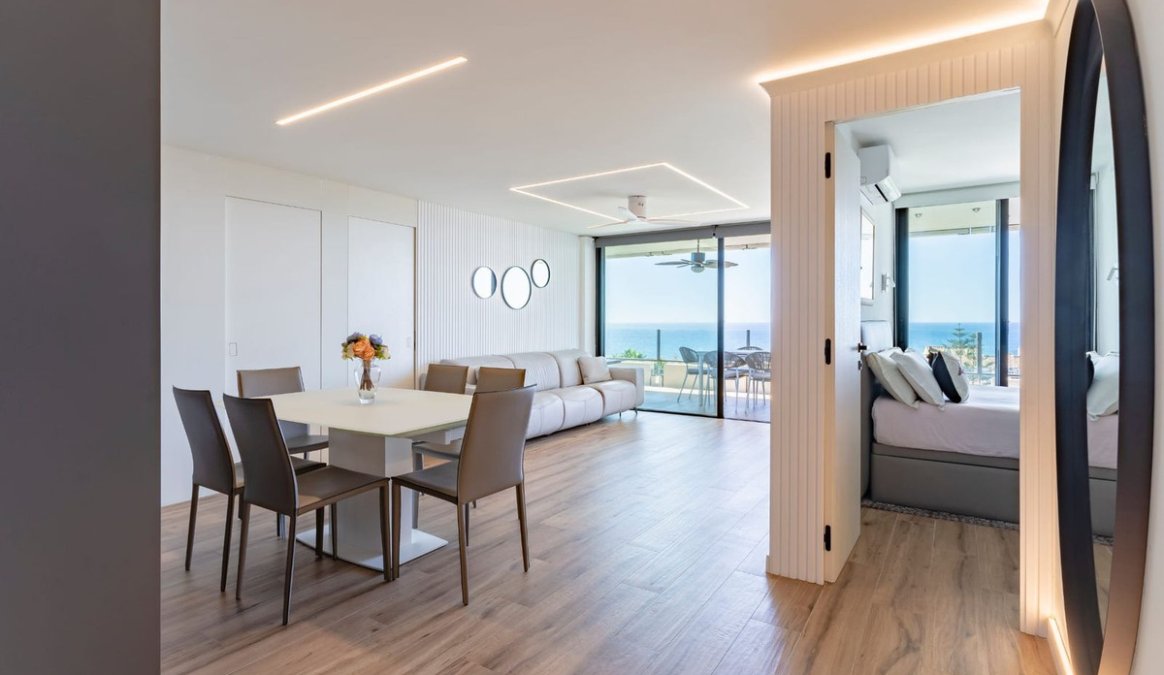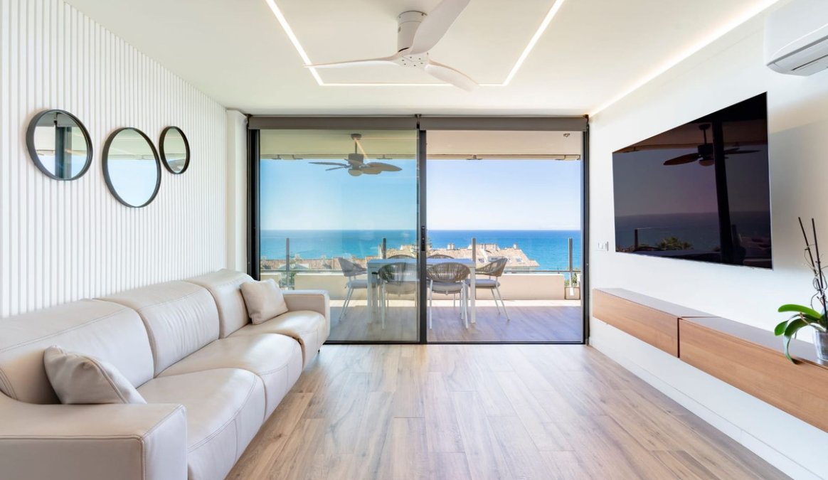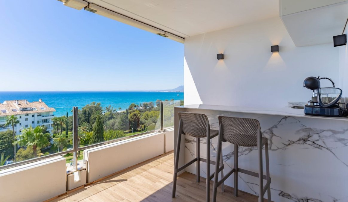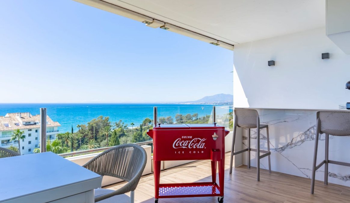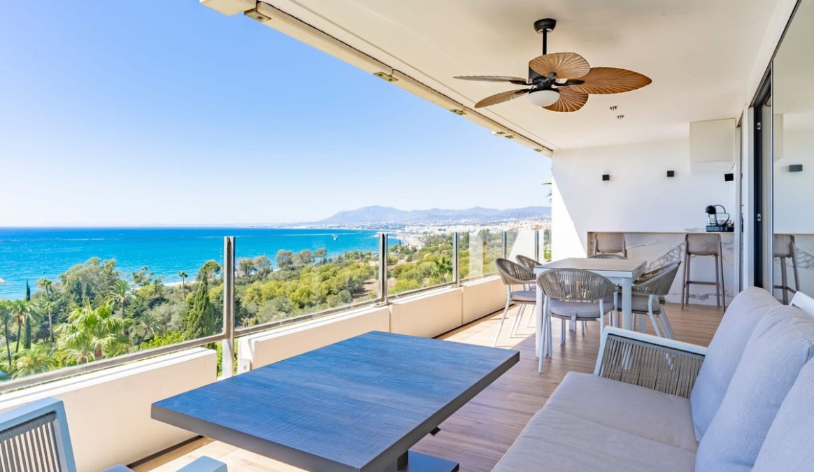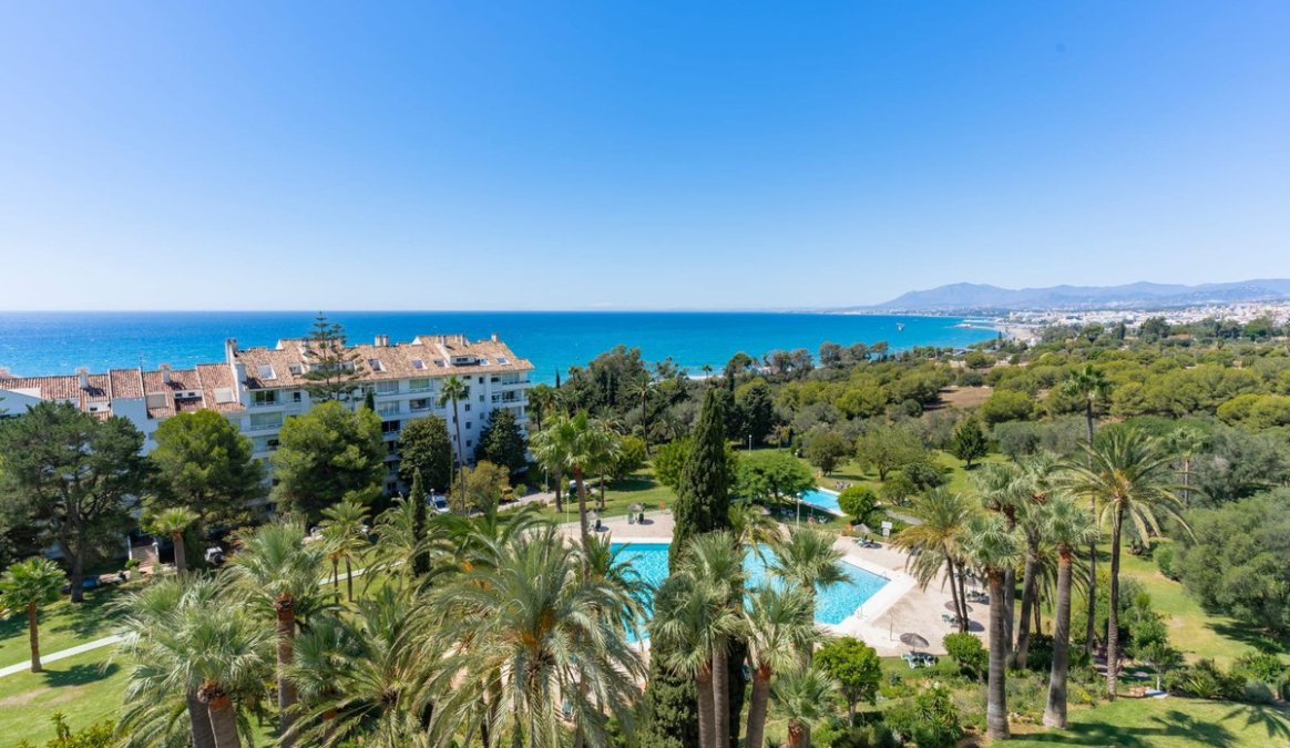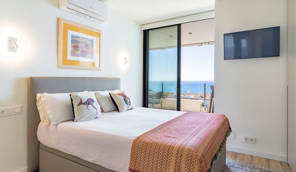 Stunningly refurbished 3-bedroom, 2-bathroom apartment offering breathtaking panoramic views of the Mediterranean Sea, the beautifully landscaped community grounds, and Marbella itself.