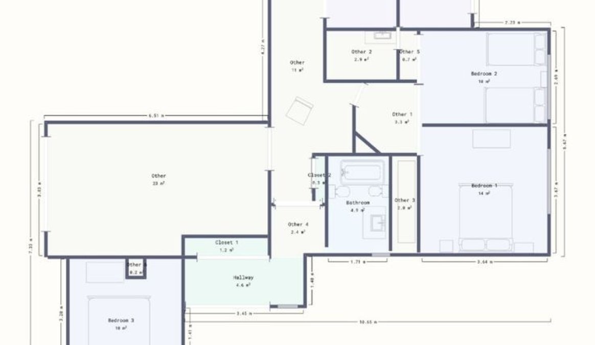 Please note: the images of the living room and kitchen have been enhanced using AI to illustrate the potential of the space in terms of design and atmosphere. The bedrooms are shown as they are in reality.