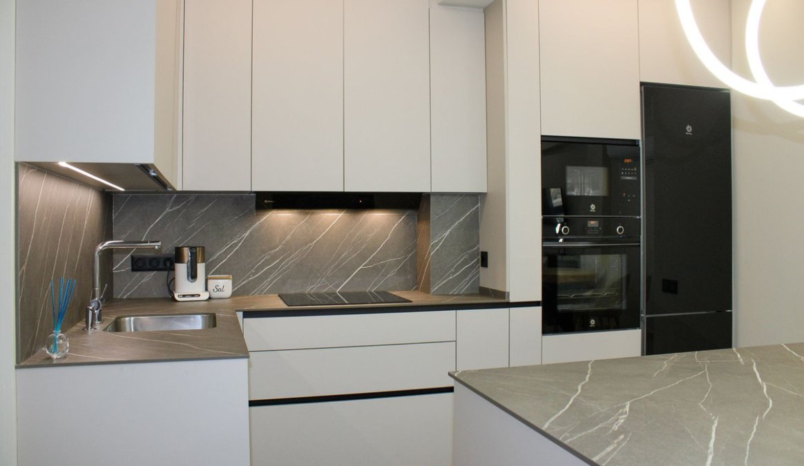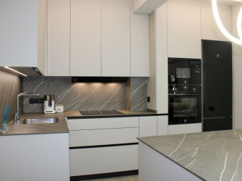 A spacious open plan living area with kitchen and kitchen island, as well as living room with dining area and a glazed balcony. Top quality kitchen appliances,