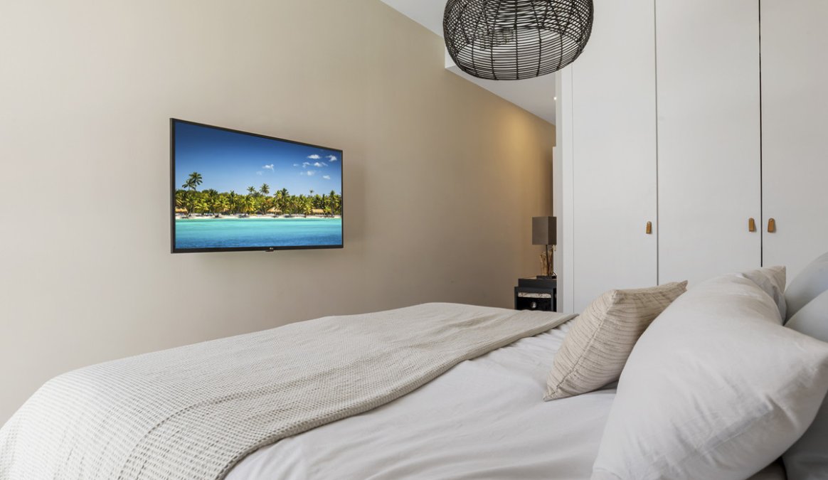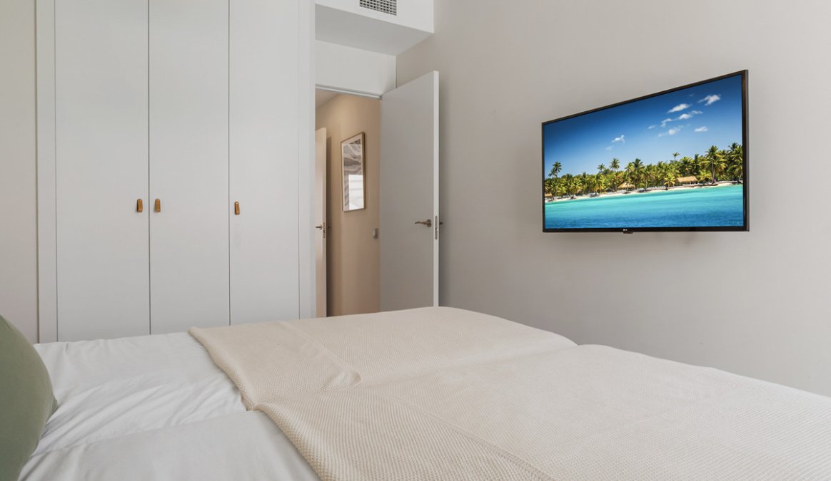 The master bedroom includes fitted wardrobes and an en-suite bathroom, while the guest bedroom is served by a separate bathroom. The property also benefits from a private rooftop solarium, offering additional outdoor space suitable for relaxing or entertaining.