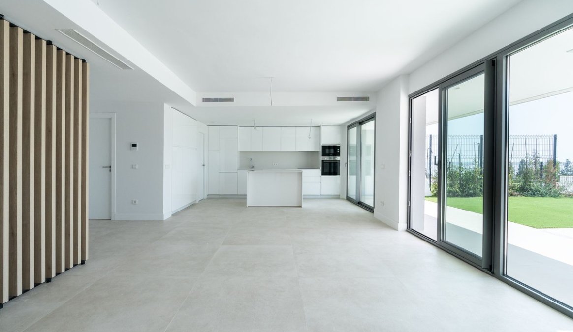 The main level features a very spacious open plan kitchen/living/dining area measuring 48 m2. The fully fitted modern kitchen includes Bosch appliances and an island with breakfast bar. The independent utility room is equipped with Bosch washing machine and separate Bosch tumble dryer. A guest WC is also conveniently located on this floor. The ceiling to floor windows bring natural light into the living area, which enjoys the full width of the property, and connects seamlessly with the large terrace and private garden providing an outdoor area measuring 67 m2, ideal for entertaining.