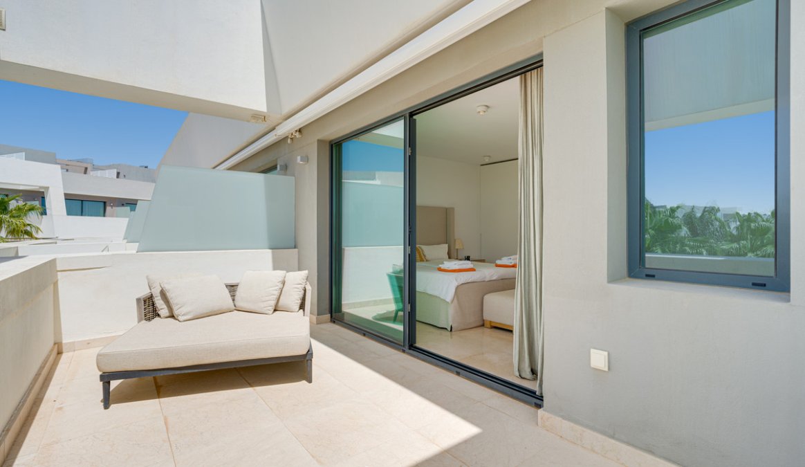 Immaculate four-bedroom townhouse located in an exclusive boutique development of just 48 contemporary luxury townhouses, set on an elevated plot in La Cala de Mijas. The gated community is surrounded by beautifully landscaped tropical gardens and offers three communal swimming pools. Ideally positioned within walking distance to the beach and the vibrant town centre of La Cala.