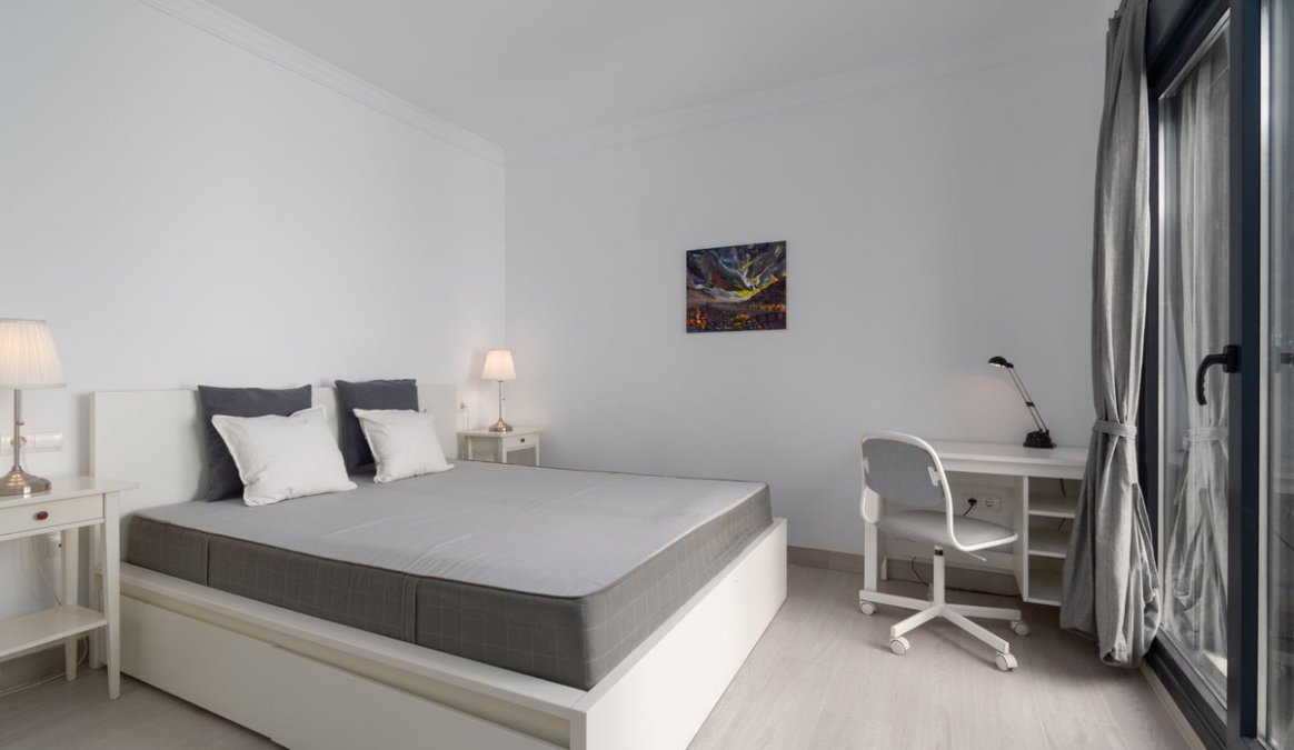 The property is sold fully furnished, including quality features such as laminated wood flooring in the bedrooms, built-in wardrobes, Mitsubishi inverter air conditioning, mosquito screens, electric metal shutters, and a water filtration system for drinking water.